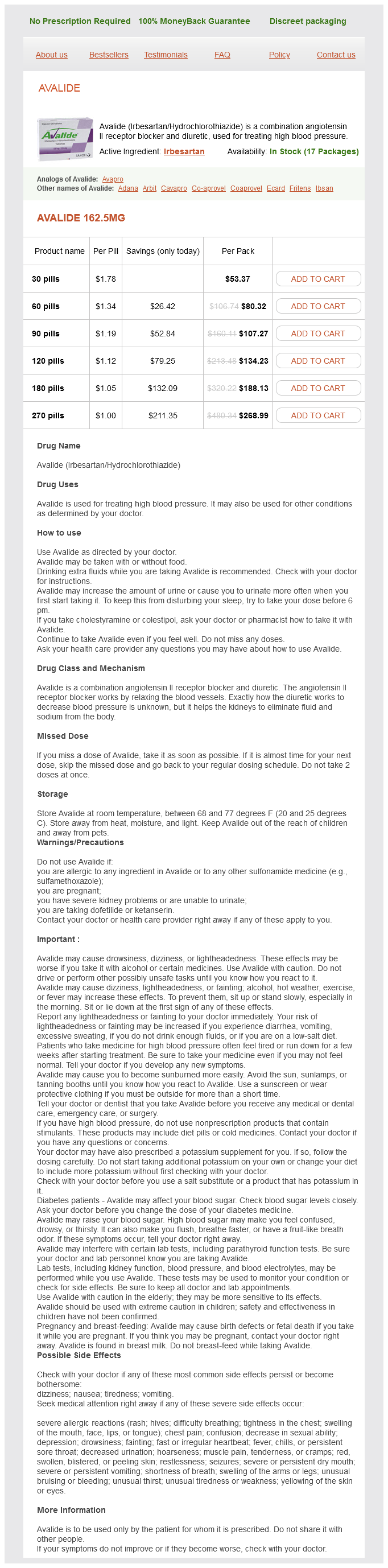 Avalide dosages: 162.5 mgAvalide packs: 30 pills, 60 pills, 90 pills, 120 pills, 180 pills, 270 pills