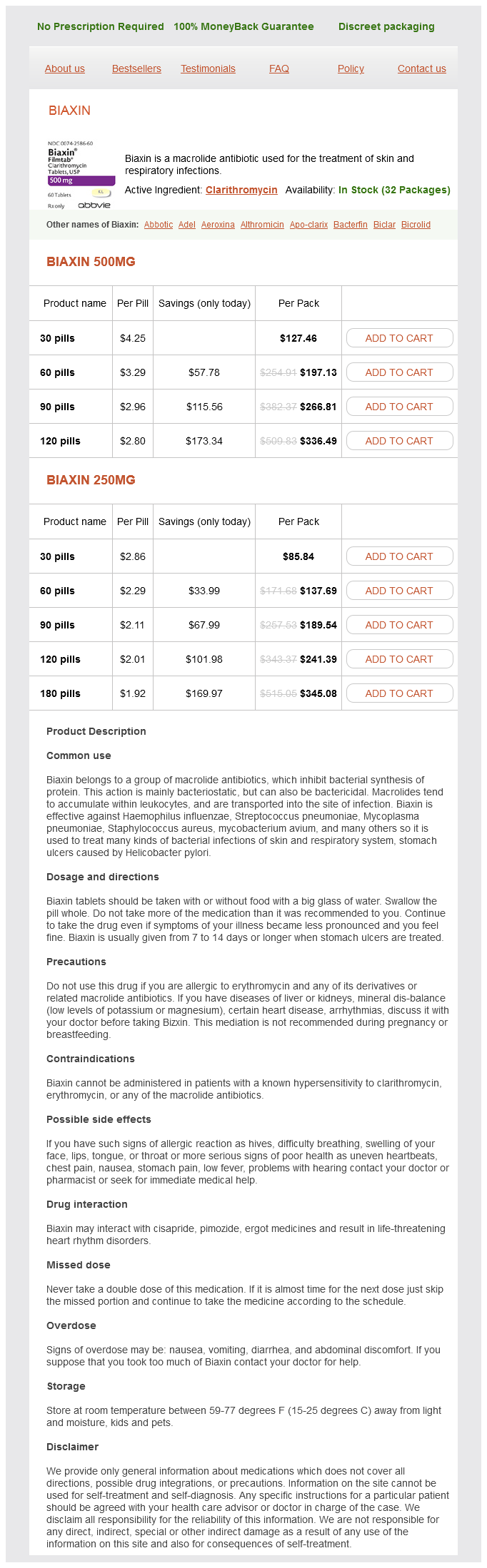 Biaxin dosages: 500 mg, 250 mgBiaxin packs: 30 pills, 60 pills, 90 pills, 120 pills, 180 pills