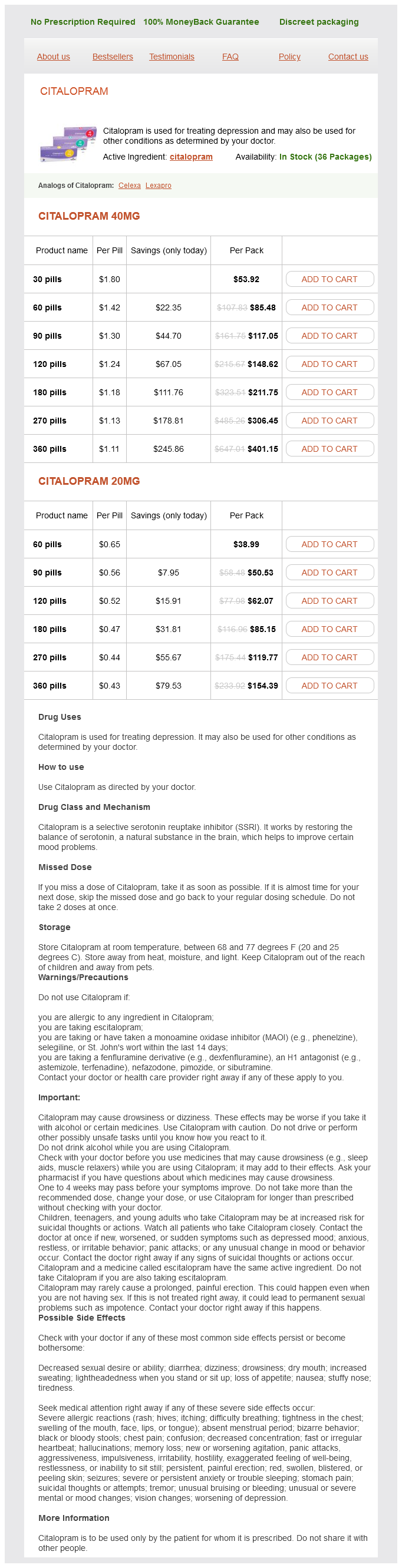 Citalopram dosages: 40 mg, 20 mgCitalopram packs: 30 pills, 60 pills, 90 pills, 120 pills, 180 pills, 270 pills, 360 pills