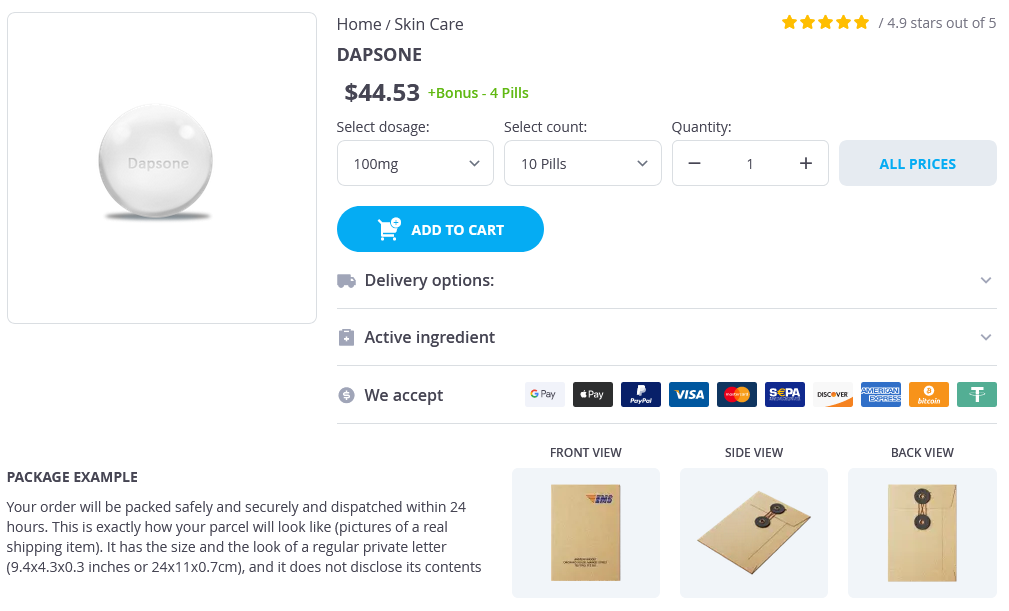 Dapsone dosages: 100 mgDapsone packs: 10 pills, 30 pills, 60 pills, 90 pills, 120 pills