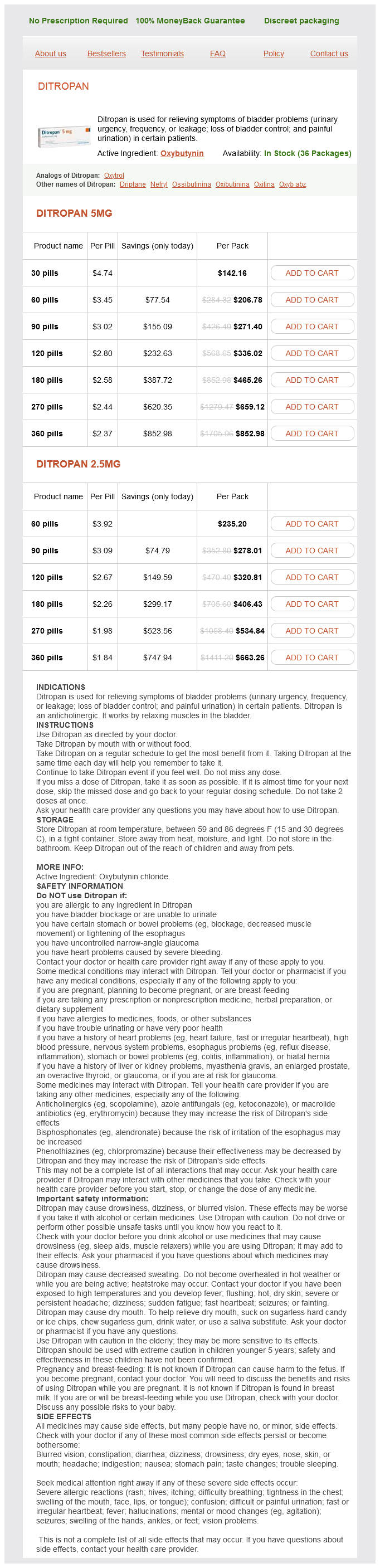 Ditropan dosages: 5 mg, 2.5 mgDitropan packs: 30 pills, 60 pills, 90 pills, 120 pills, 180 pills, 270 pills, 360 pills