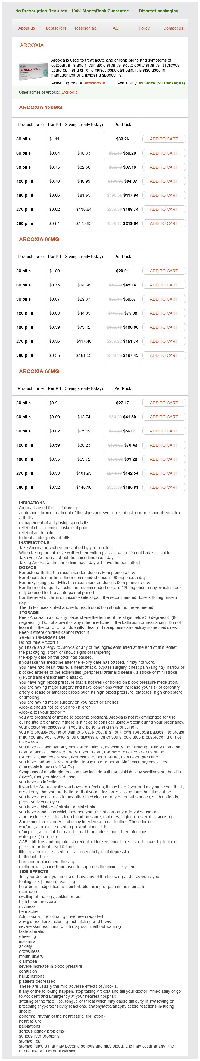 Etoricoxib dosages: 120 mg, 90 mg, 60 mgEtoricoxib packs: 30 pills, 60 pills, 90 pills, 120 pills, 180 pills, 270 pills, 360 pills