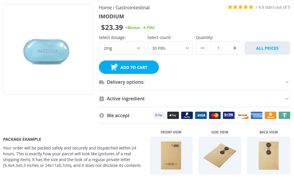 Imodium dosages: 2 mgImodium packs: 30 pills, 60 pills, 90 pills, 120 pills, 180 pills, 270 pills, 360 pills