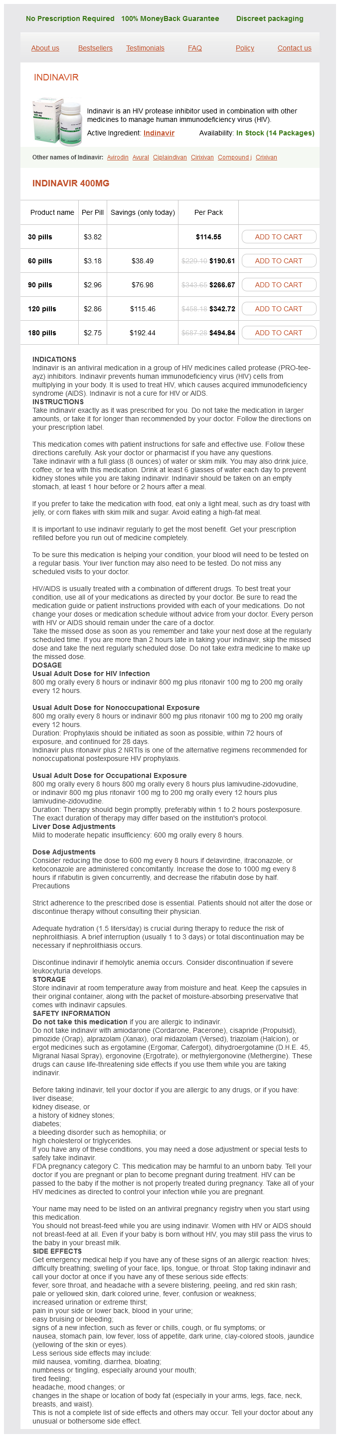 Indinavir dosages: 400 mgIndinavir packs: 30 pills, 60 pills, 90 pills, 120 pills, 180 pills