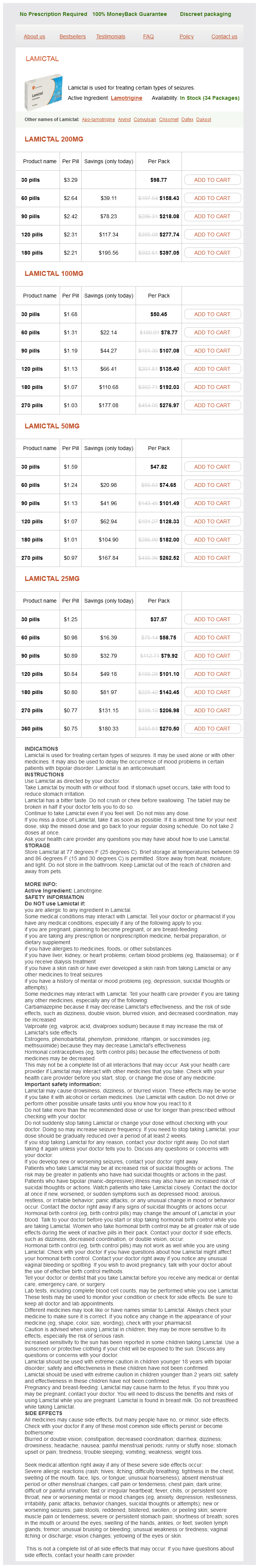 Lamotrigine dosages: 200 mg, 100 mg, 50 mg, 25 mgLamotrigine packs: 30 pills, 60 pills, 90 pills, 120 pills, 180 pills, 270 pills, 360 pills