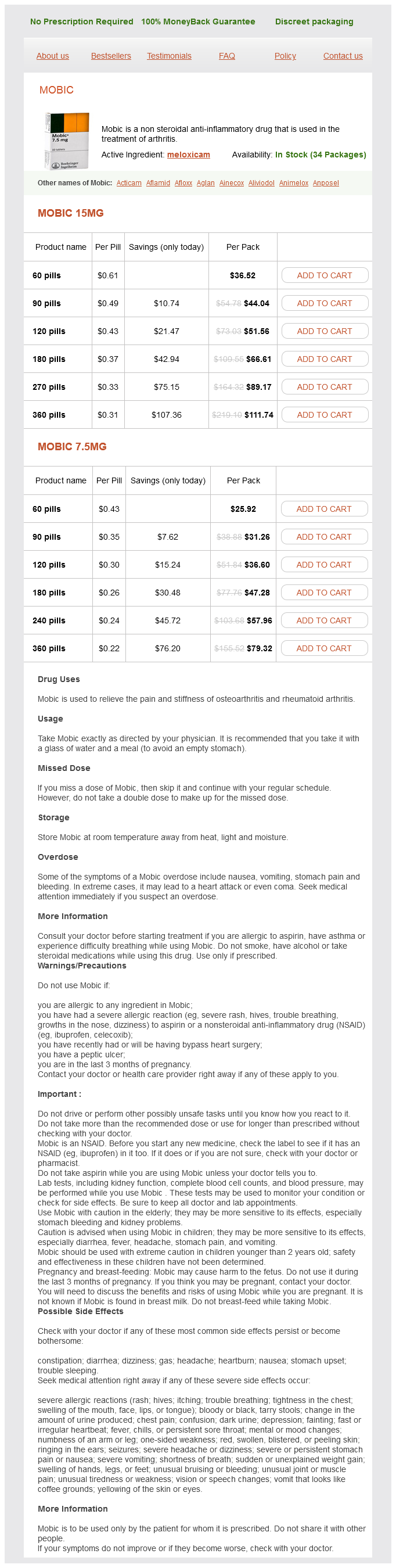Mobic dosages: 15 mg, 7.5 mgMobic packs: 60 pills, 90 pills, 120 pills, 180 pills, 270 pills, 360 pills, 240 pills