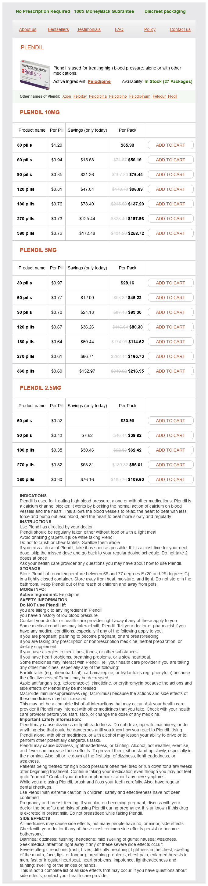Plendil dosages: 10 mg, 5 mg, 2.5 mgPlendil packs: 30 pills, 60 pills, 90 pills, 120 pills, 180 pills, 270 pills, 360 pills