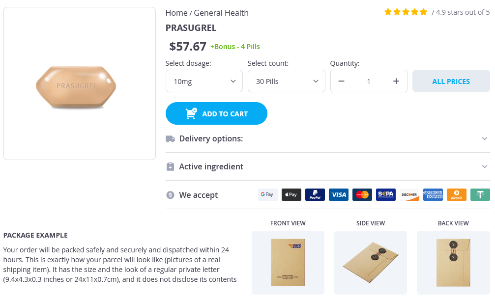 Prasugrel dosages: 10 mgPrasugrel packs: 30 pills, 60 pills, 90 pills, 120 pills, 180 pills, 360 pills