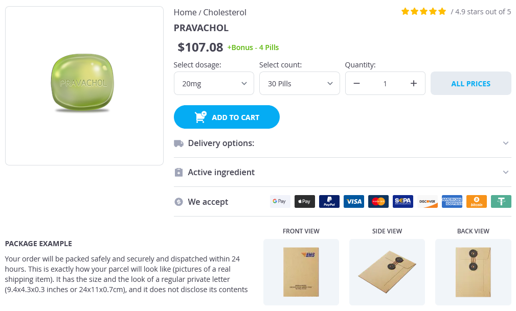 Pravachol dosages: 20 mg, 10 mgPravachol packs: 30 pills, 60 pills, 90 pills, 120 pills, 180 pills, 270 pills