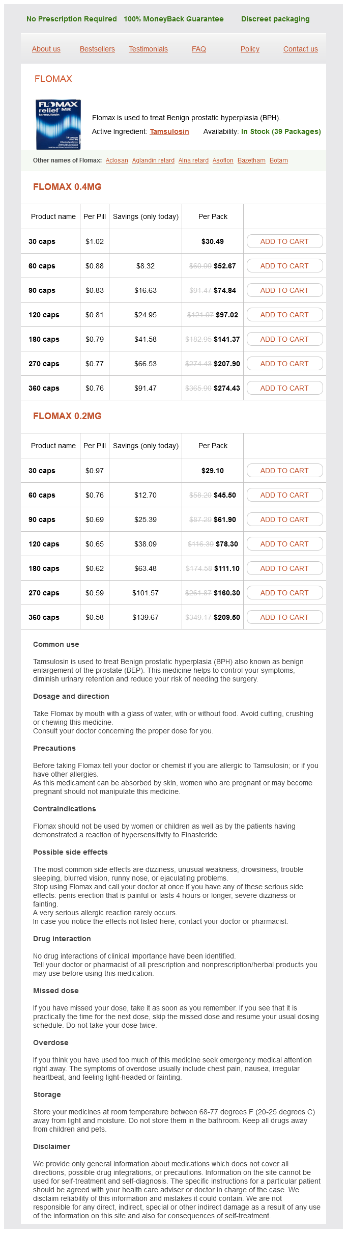 Tamsulosin dosages: 0.4 mg, 0.2 mgTamsulosin packs: 30 caps, 60 caps, 90 caps, 120 caps, 180 caps, 270 caps, 360 caps