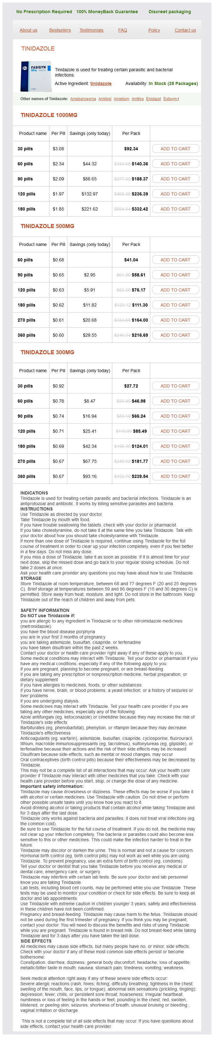 Tinidazole dosages: 1000 mg, 500 mg, 300 mgTinidazole packs: 30 pills, 60 pills, 90 pills, 120 pills, 180 pills, 270 pills, 360 pills
