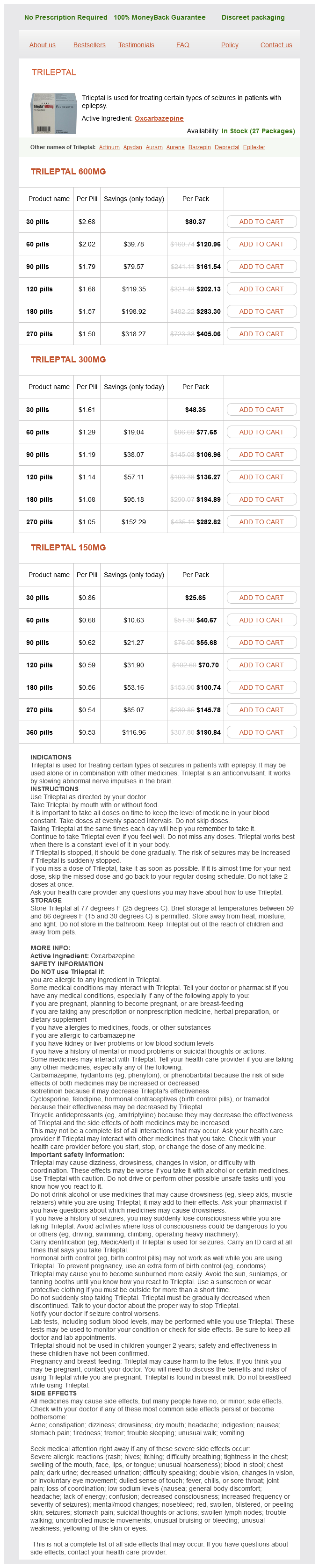 Trileptal dosages: 600 mg, 300 mg, 150 mgTrileptal packs: 30 pills, 60 pills, 90 pills, 120 pills, 180 pills, 270 pills, 360 pills