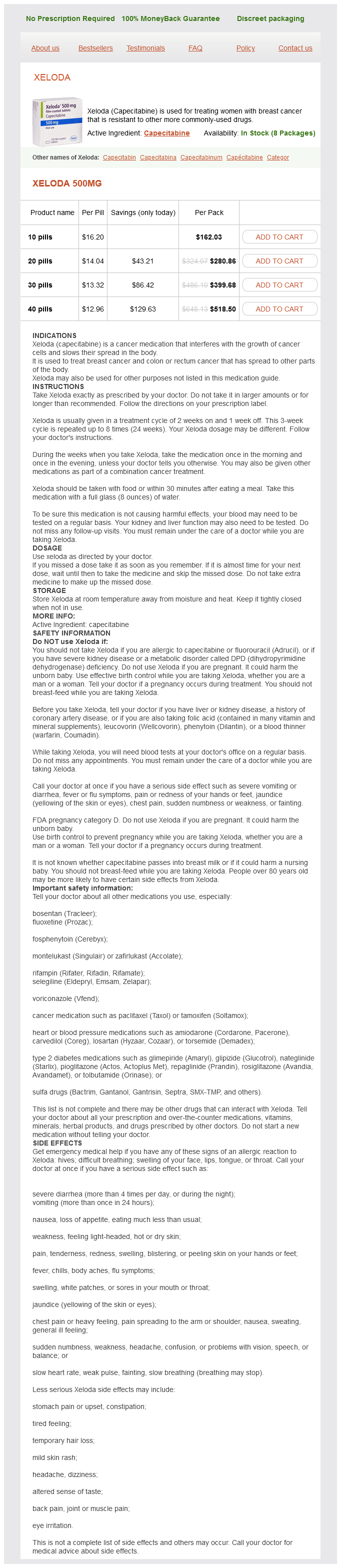 Xeloda dosages: 500 mg, 500 mgXeloda packs: 10 pills, 20 pills, 30 pills, 40 pills